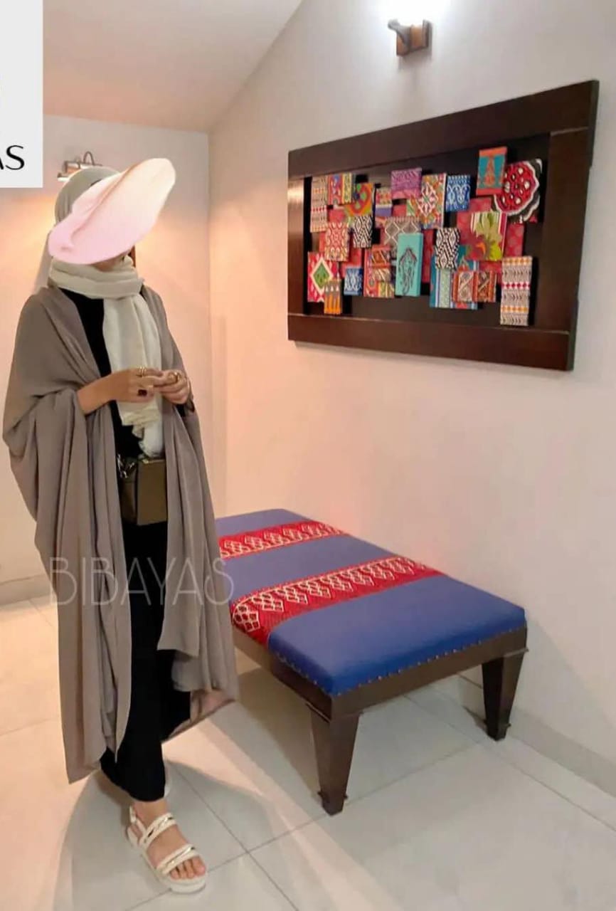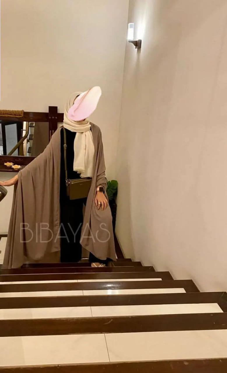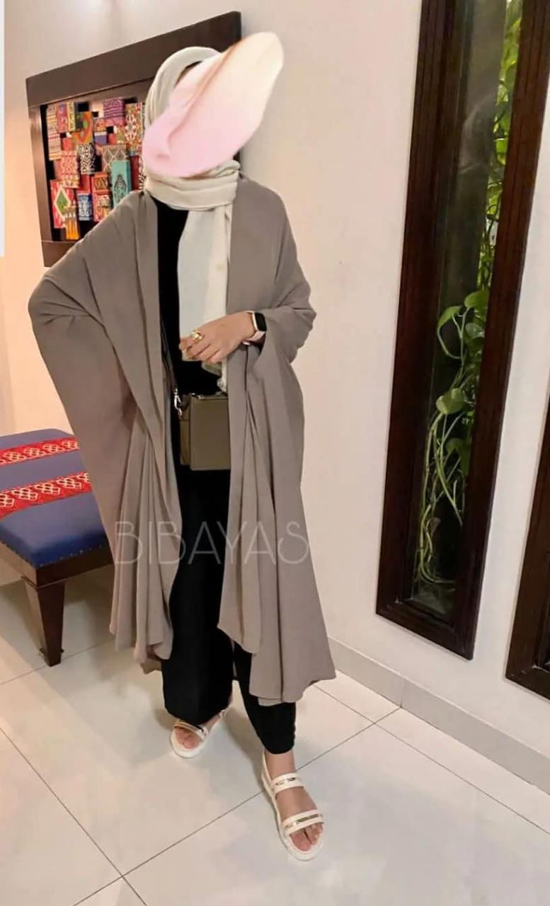 A cape style chaddar in plain fawn colored Georgette with hand cuts to hold it in place.