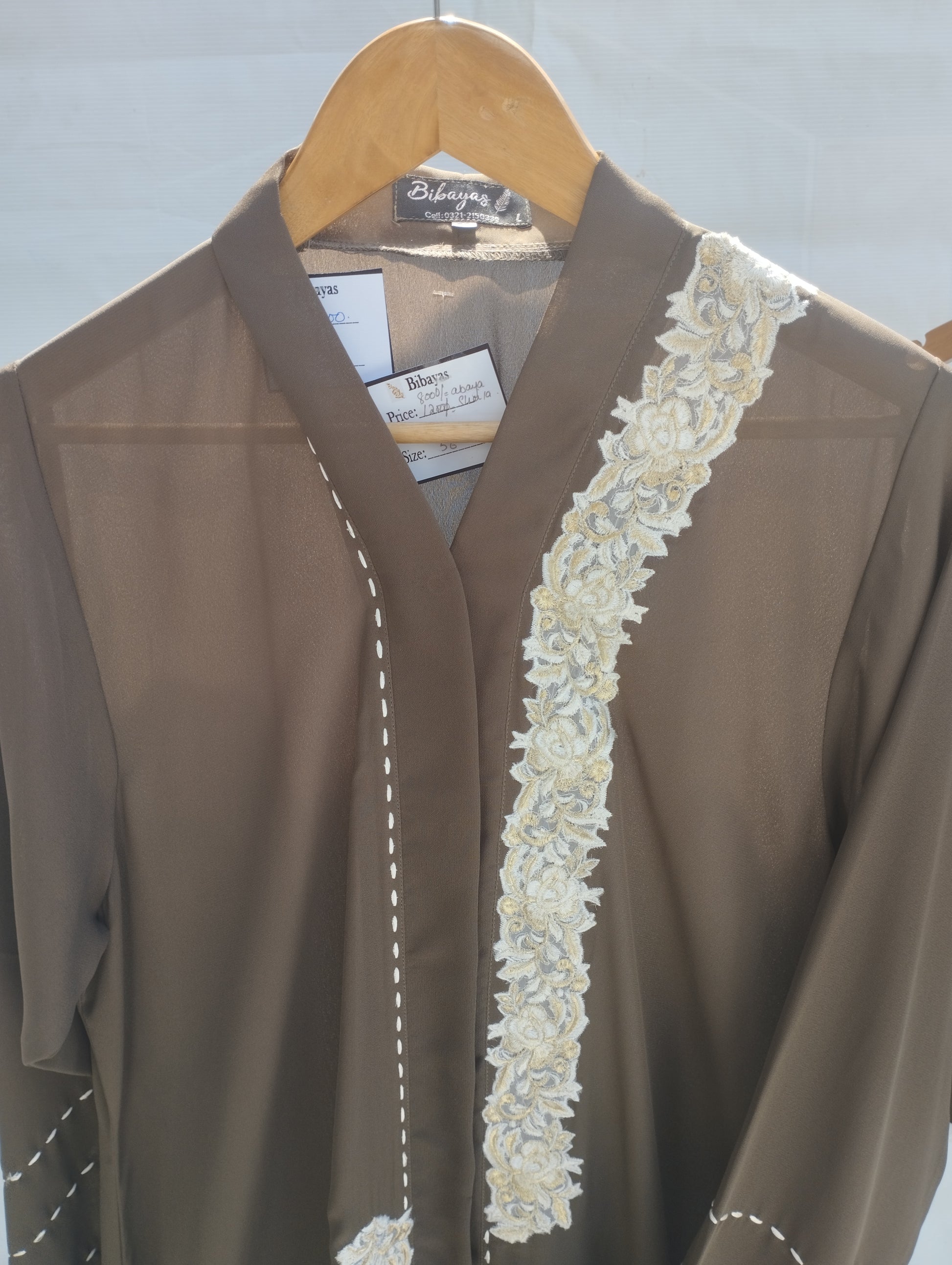 A brown georgette abaya with intricate lace and stitching details on the front and sleeves. Paired with a brown hijab .