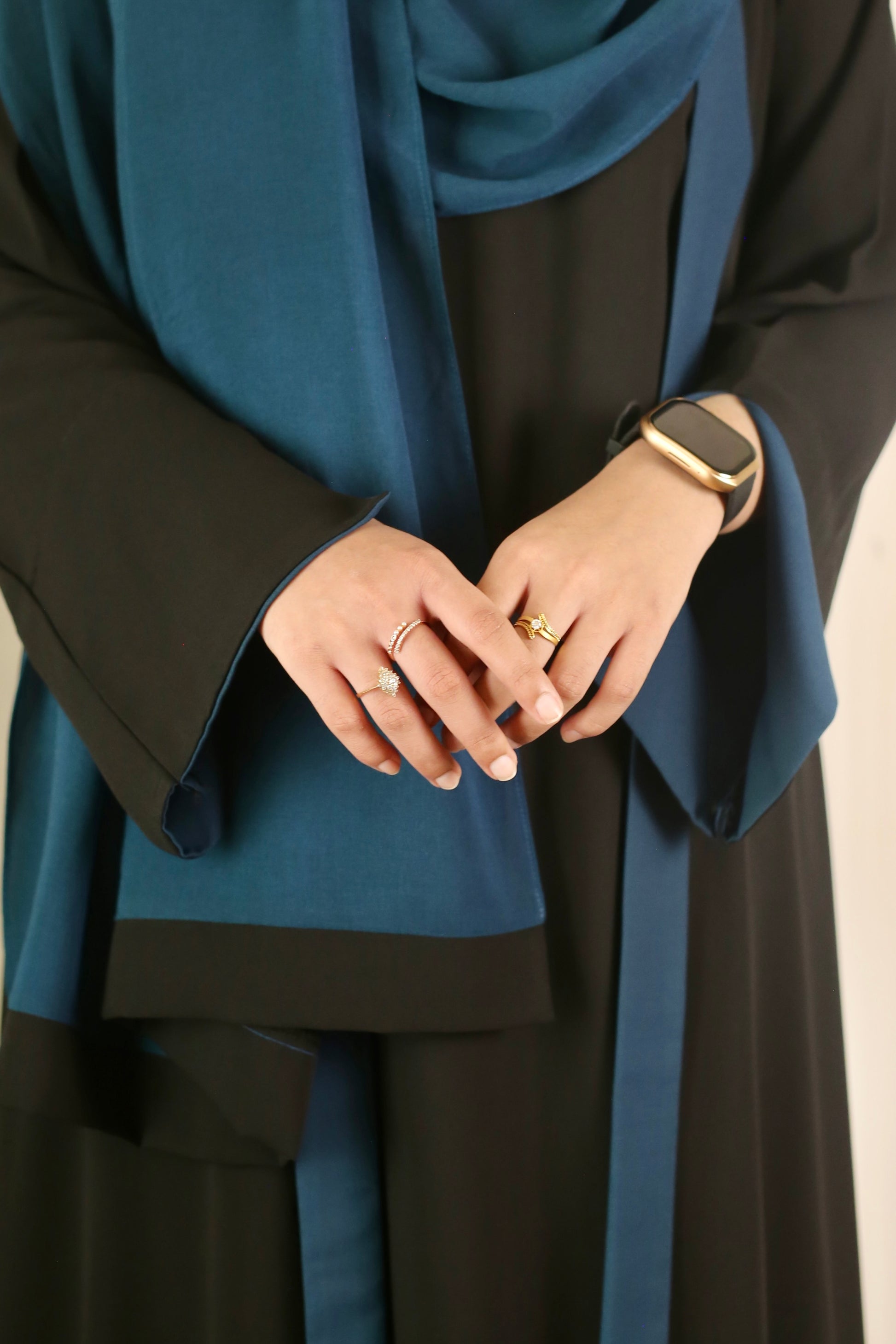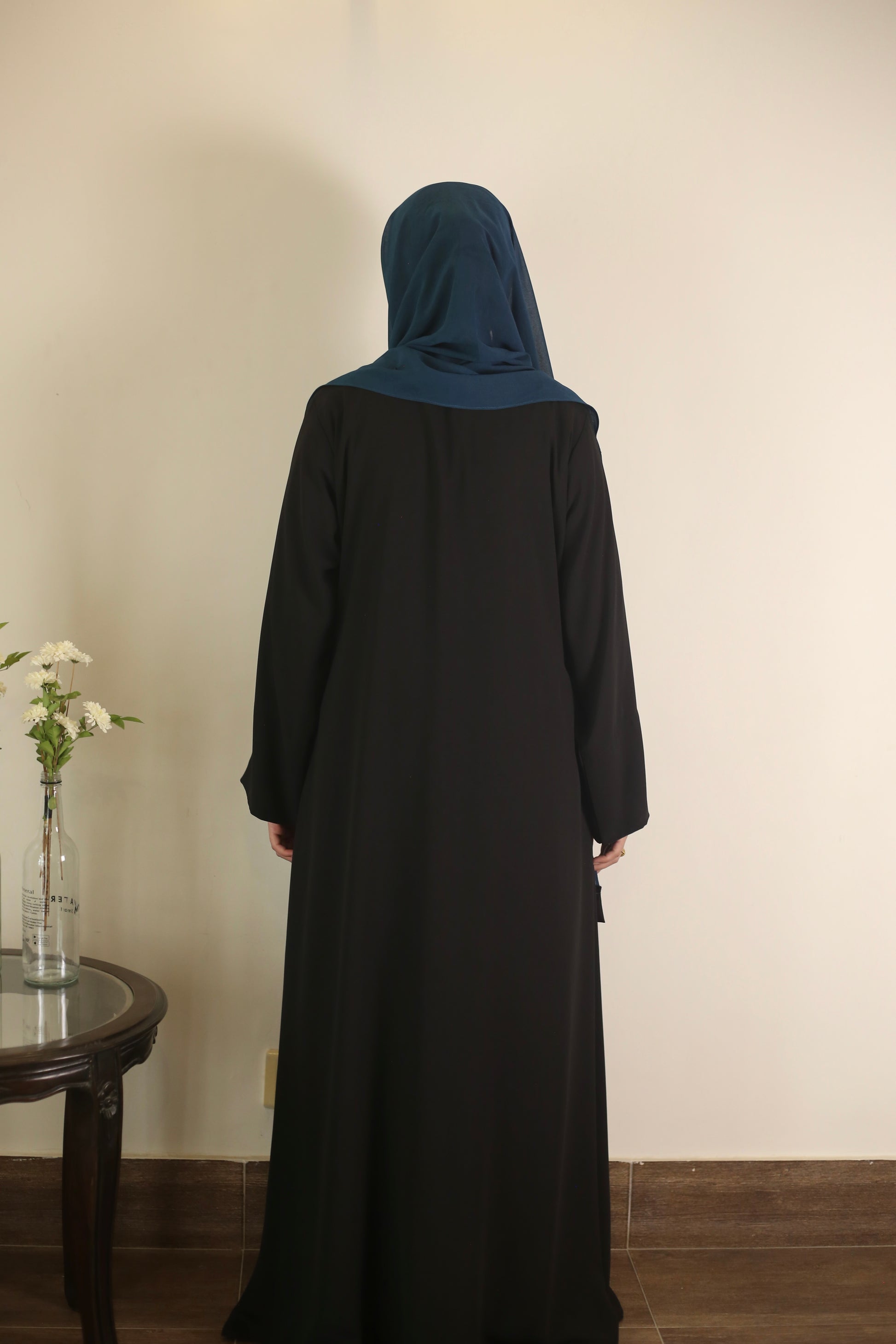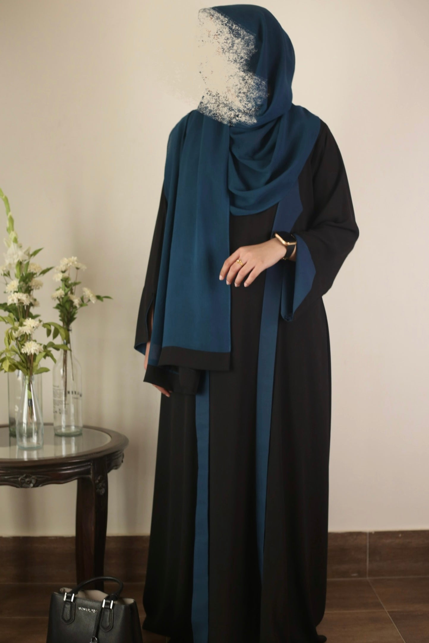 This black kimono style abaya with attached inner is elevated with sleek teal borders on the front and modern-cut sleeves in teal, adding a bold yet refined touch. Paired with a matching teal hijab, it’s the perfect blend of chic and effortless grace!