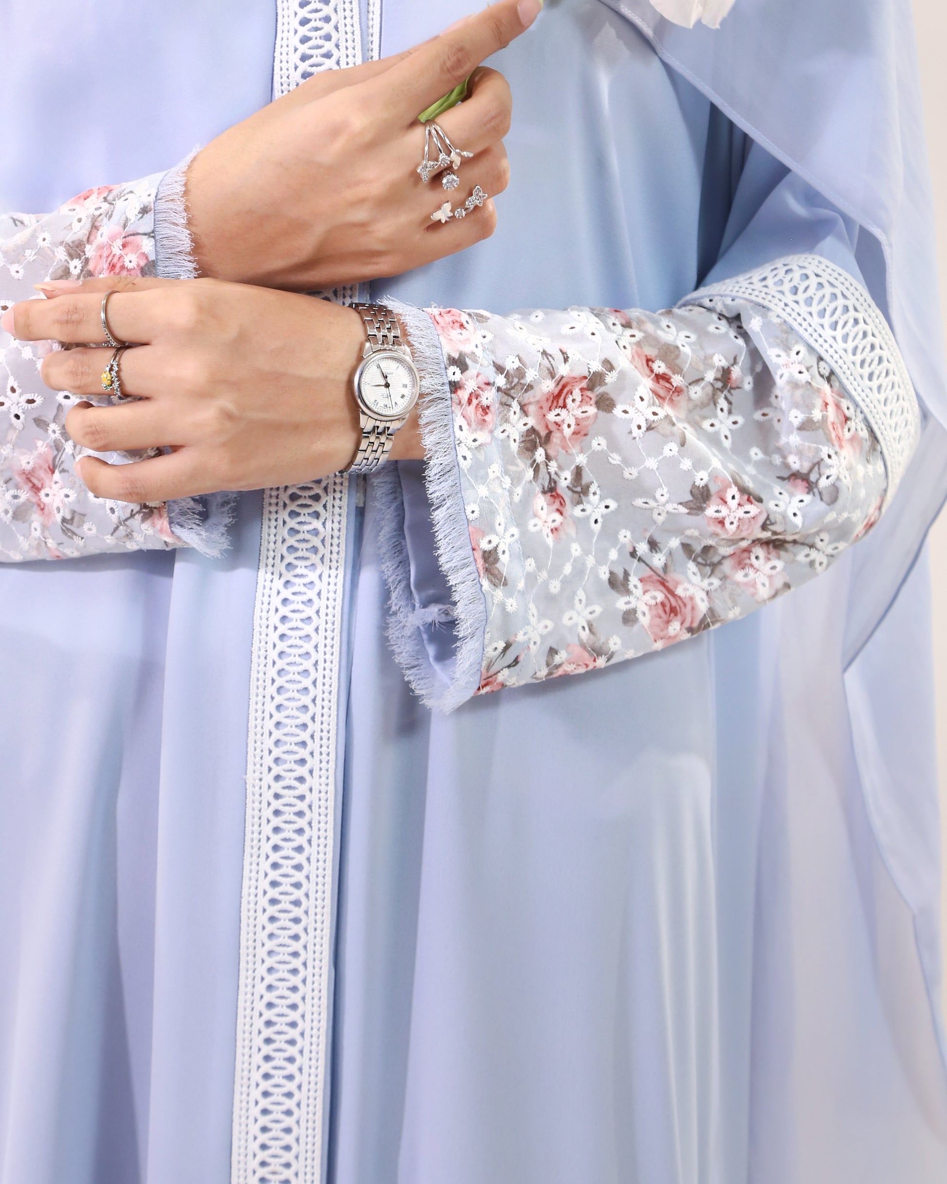 Soft pastel prints, breezy chicken sleeves, and lace that whispers elegance – this summer-perfect abaya is made for moments that matter. Styled with a matching blue hijab.