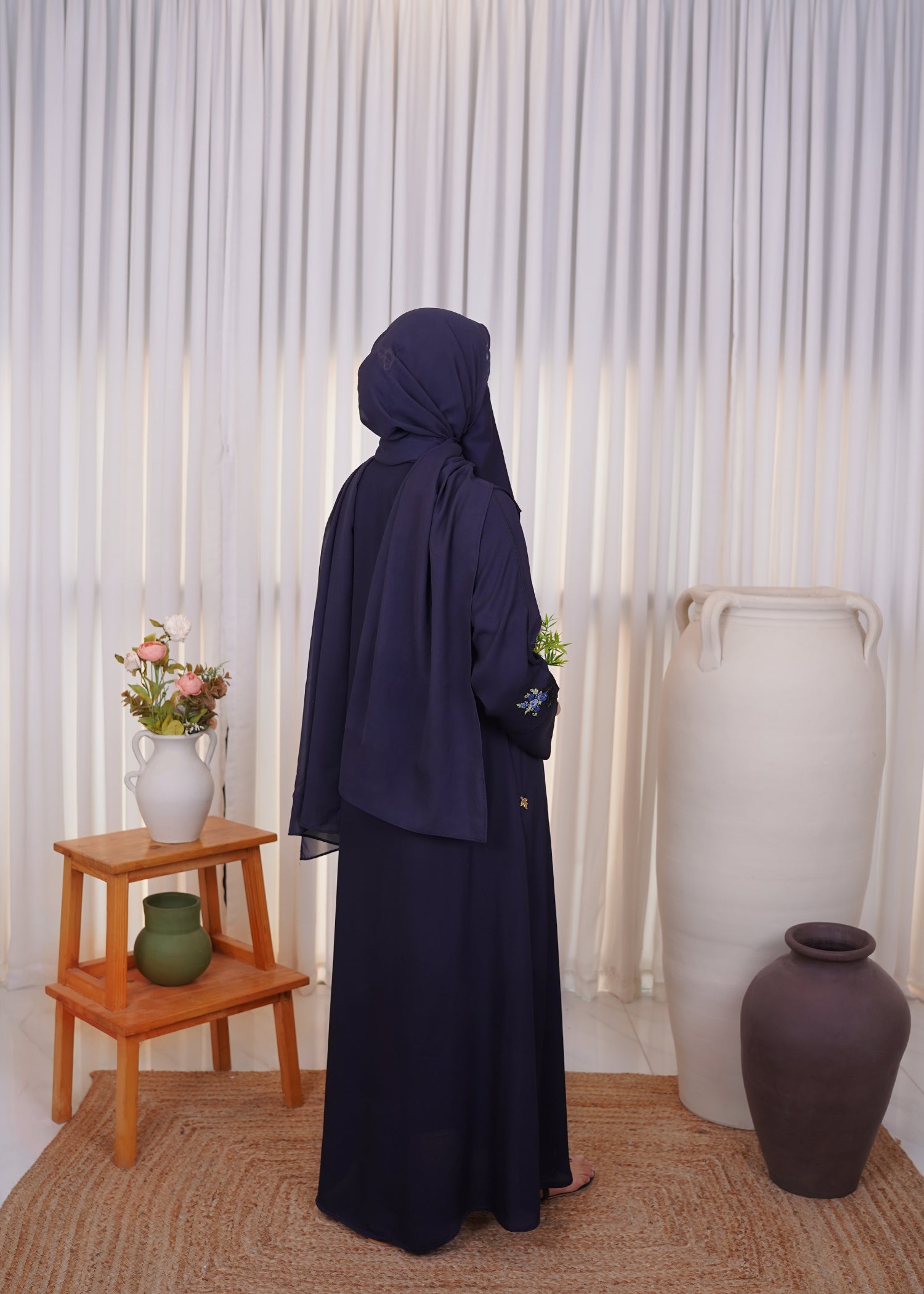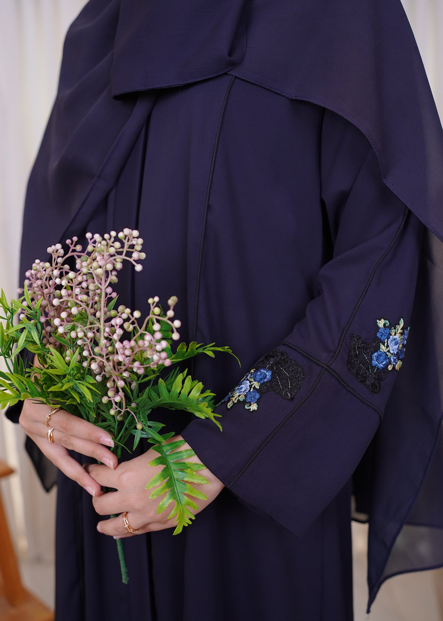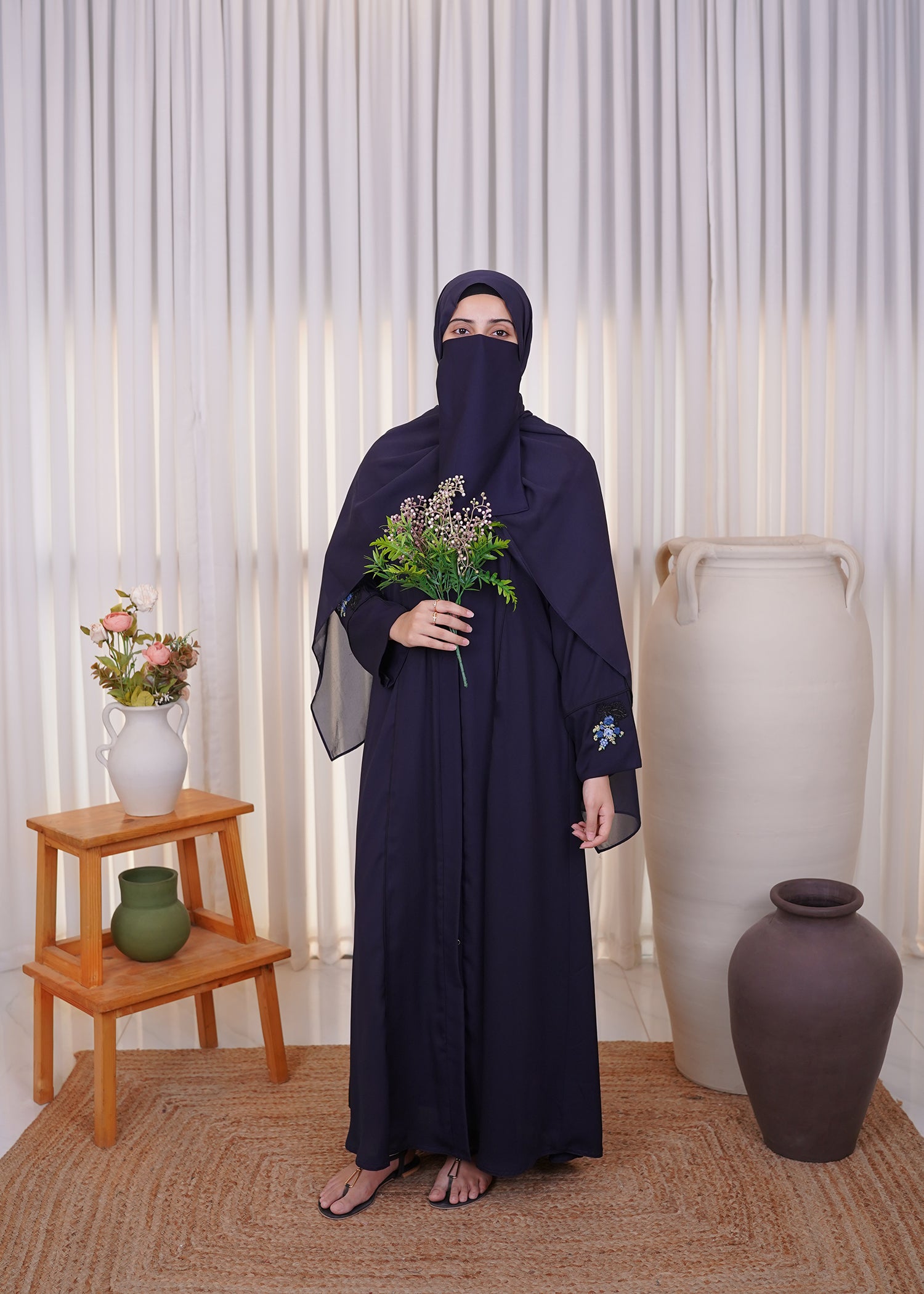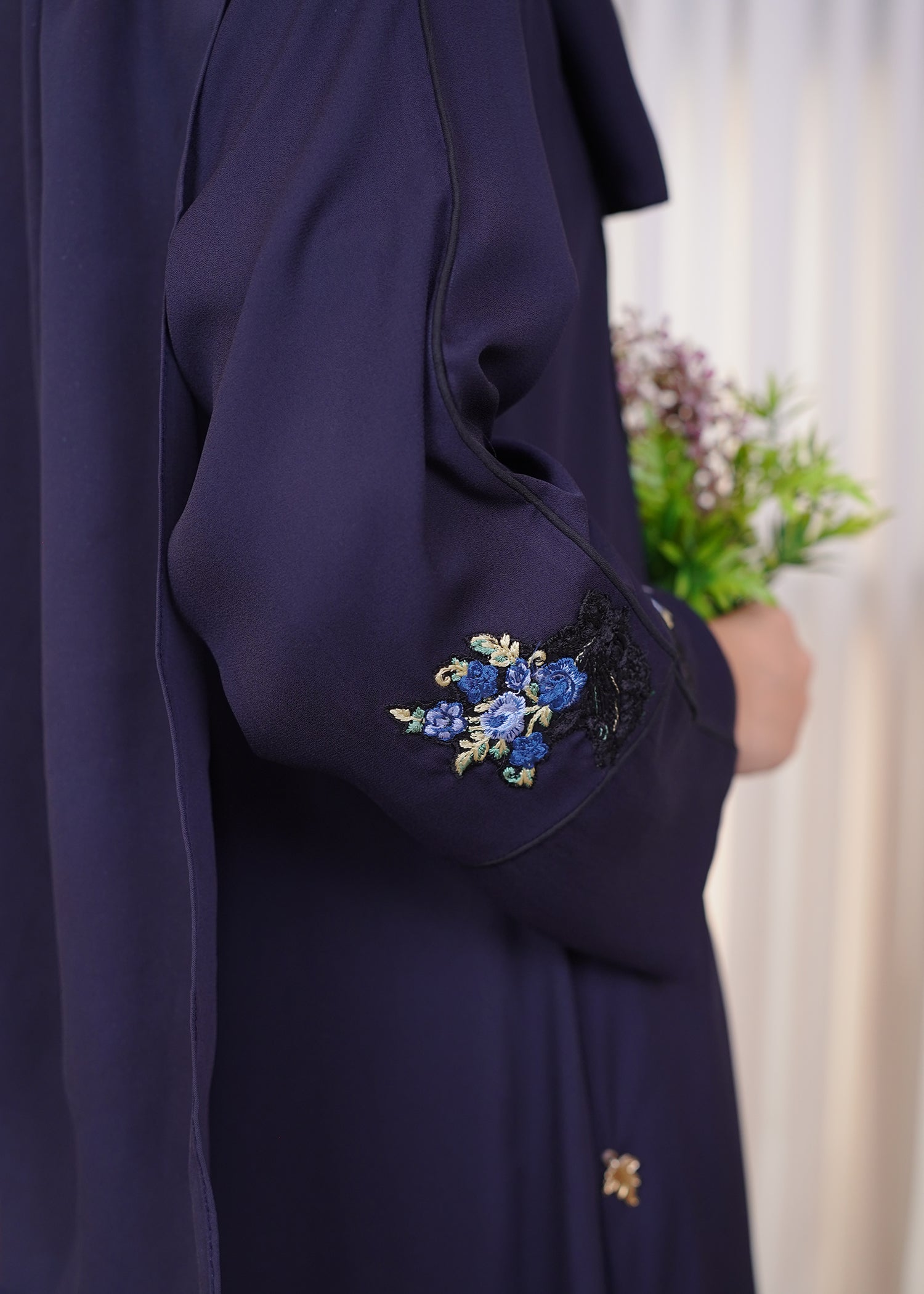 A front open navy blue abaya with delicate floral embroidery on the sleeves.