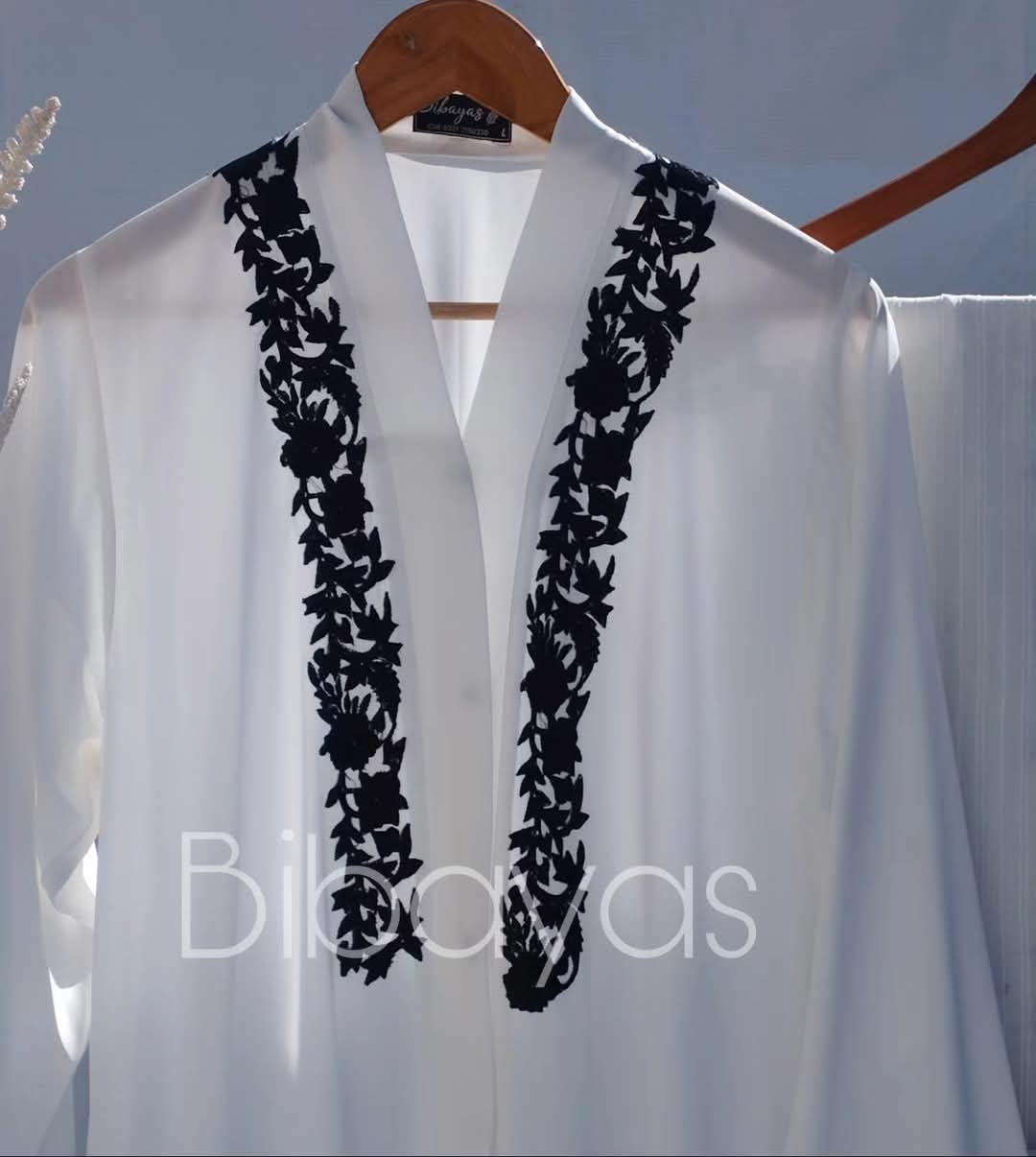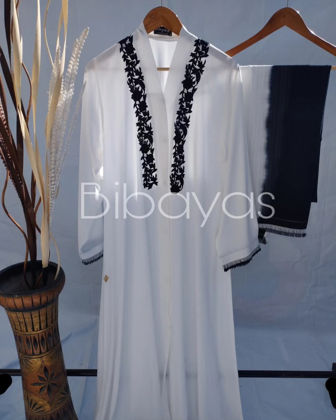 A pearl white Georgette abaya adorned by intricate black embroidered motif appliqued around the neck line for the upcoming festive season. The monochrome thread work on sleeves adds the most beautiful touch to it
