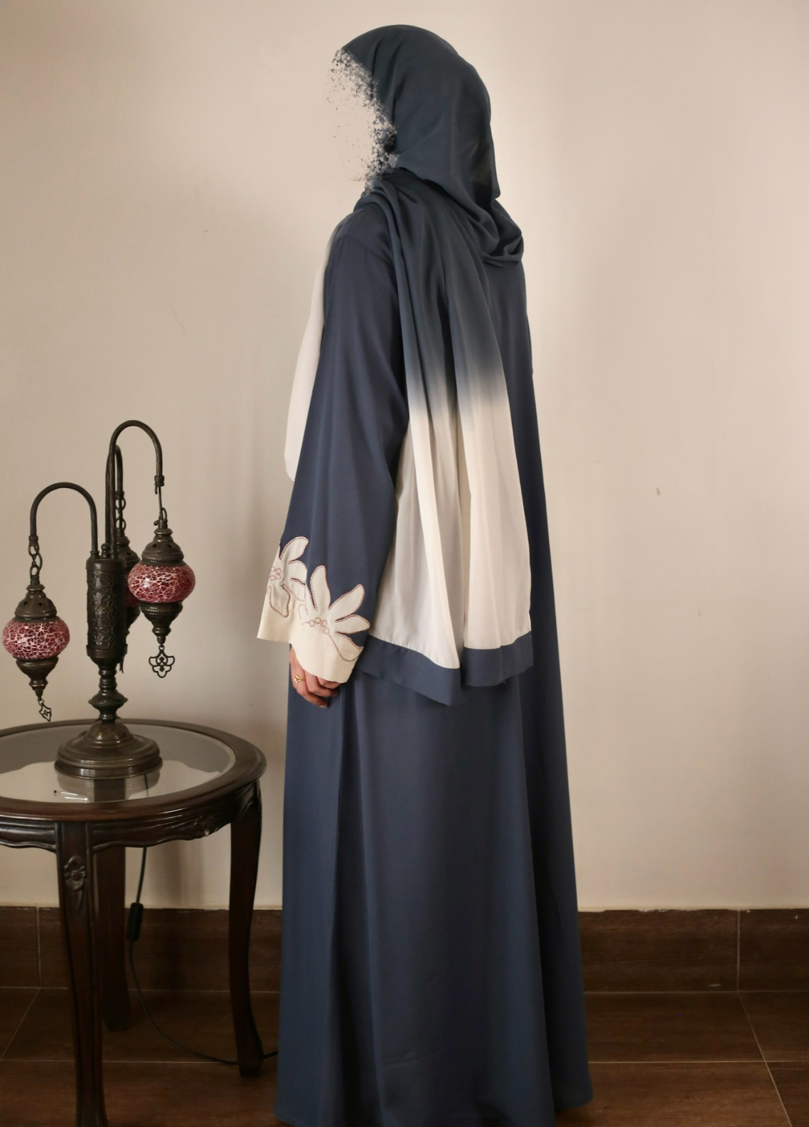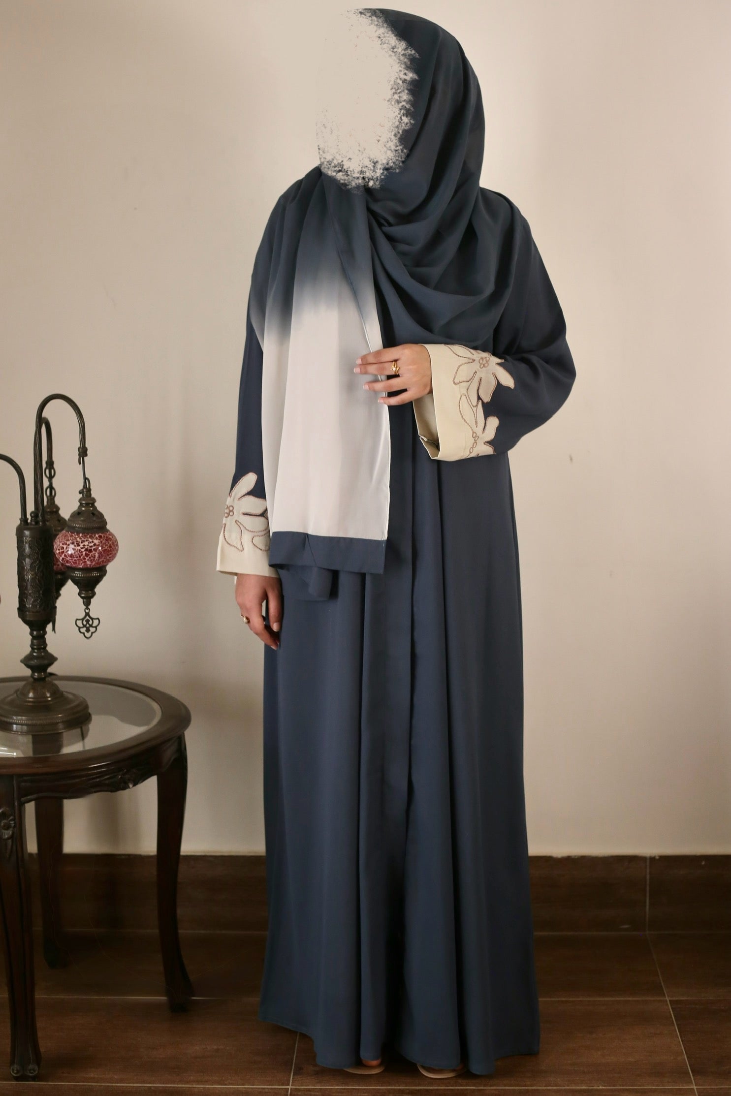Grey georgette abaya with off-white floral embroidered sleeves, paired with a two-tone hijab. Lightweight, breathable, and wuzu-friendly—your perfect companion for a serene and graceful journey.