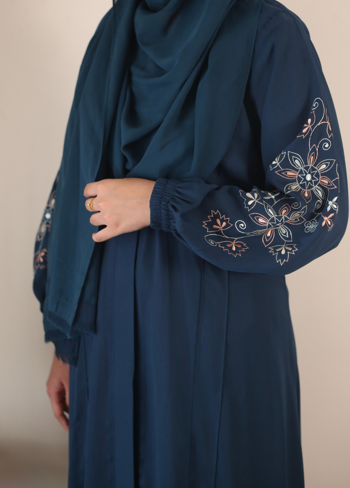 Teal elegance for your sacred journey — this abaya features soft, breathable fabric, elastic sleeves for easy wudhu, and delicate embroideryon both sleeves in peach, pink, and green. Thoughtfully made for Hajj comfort and grace.
