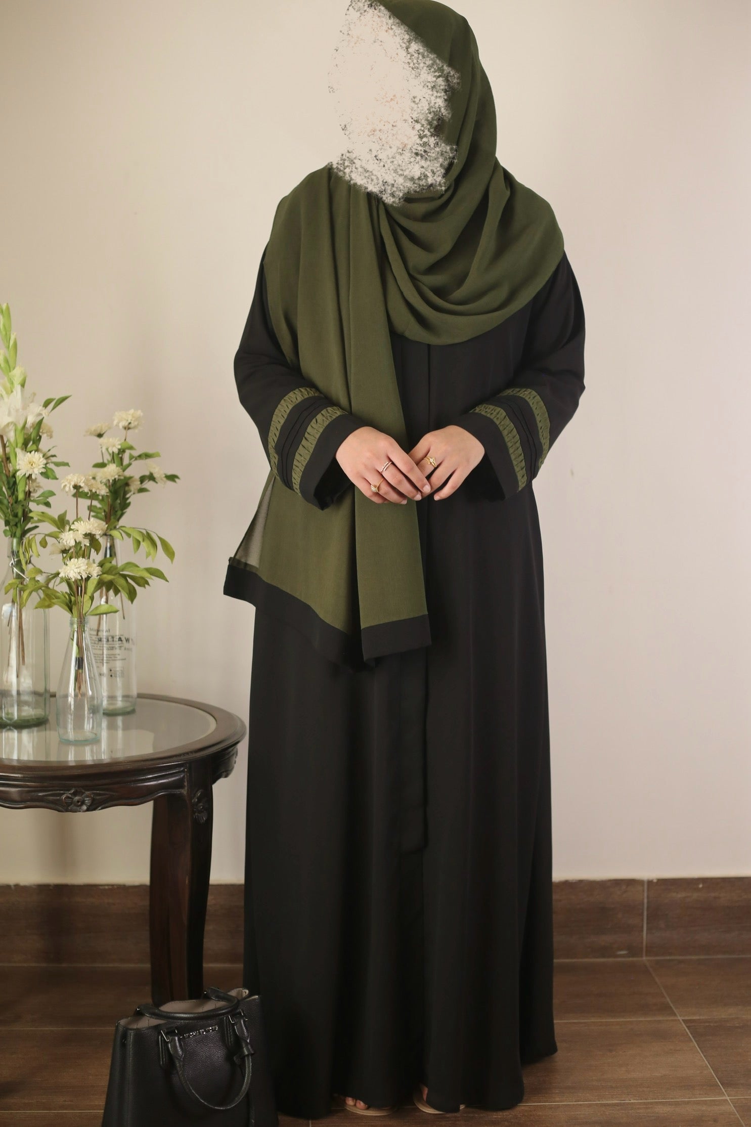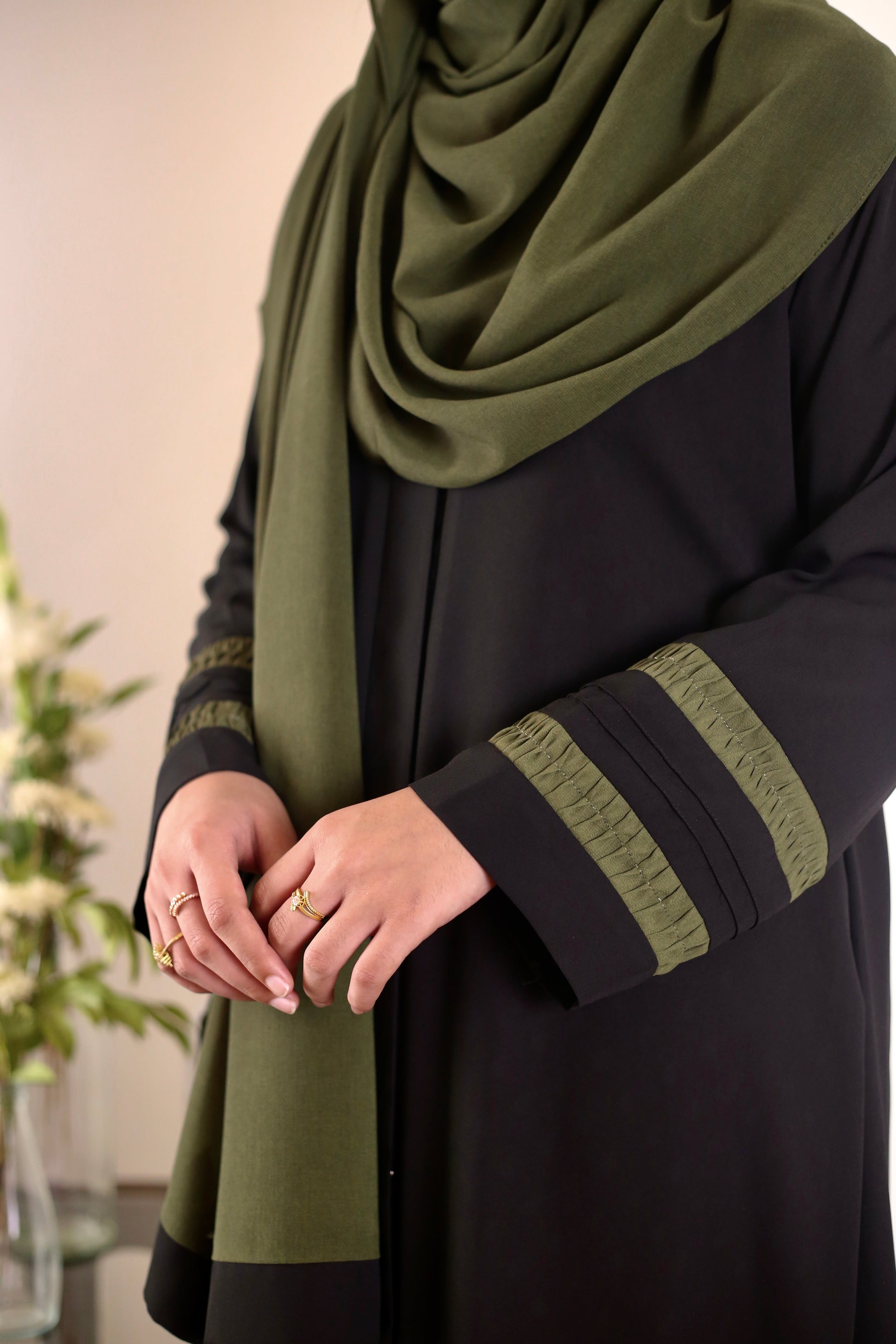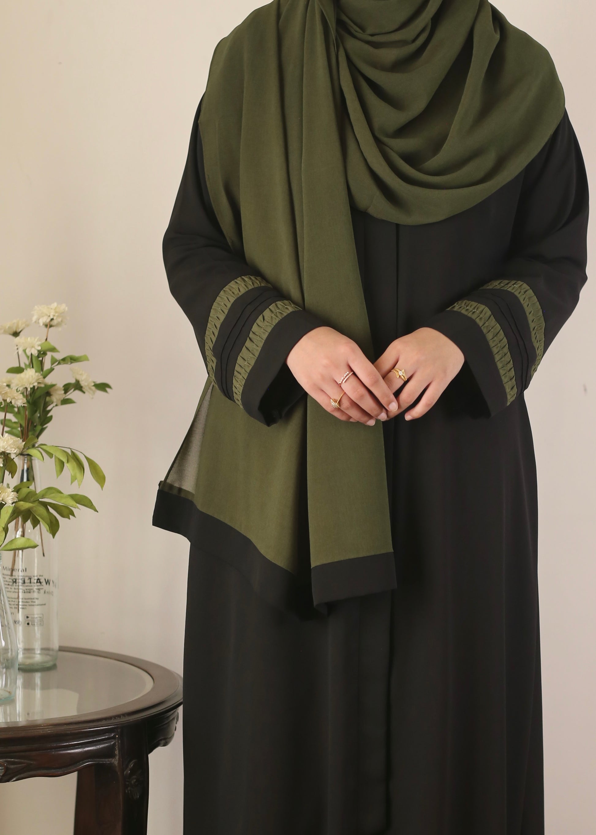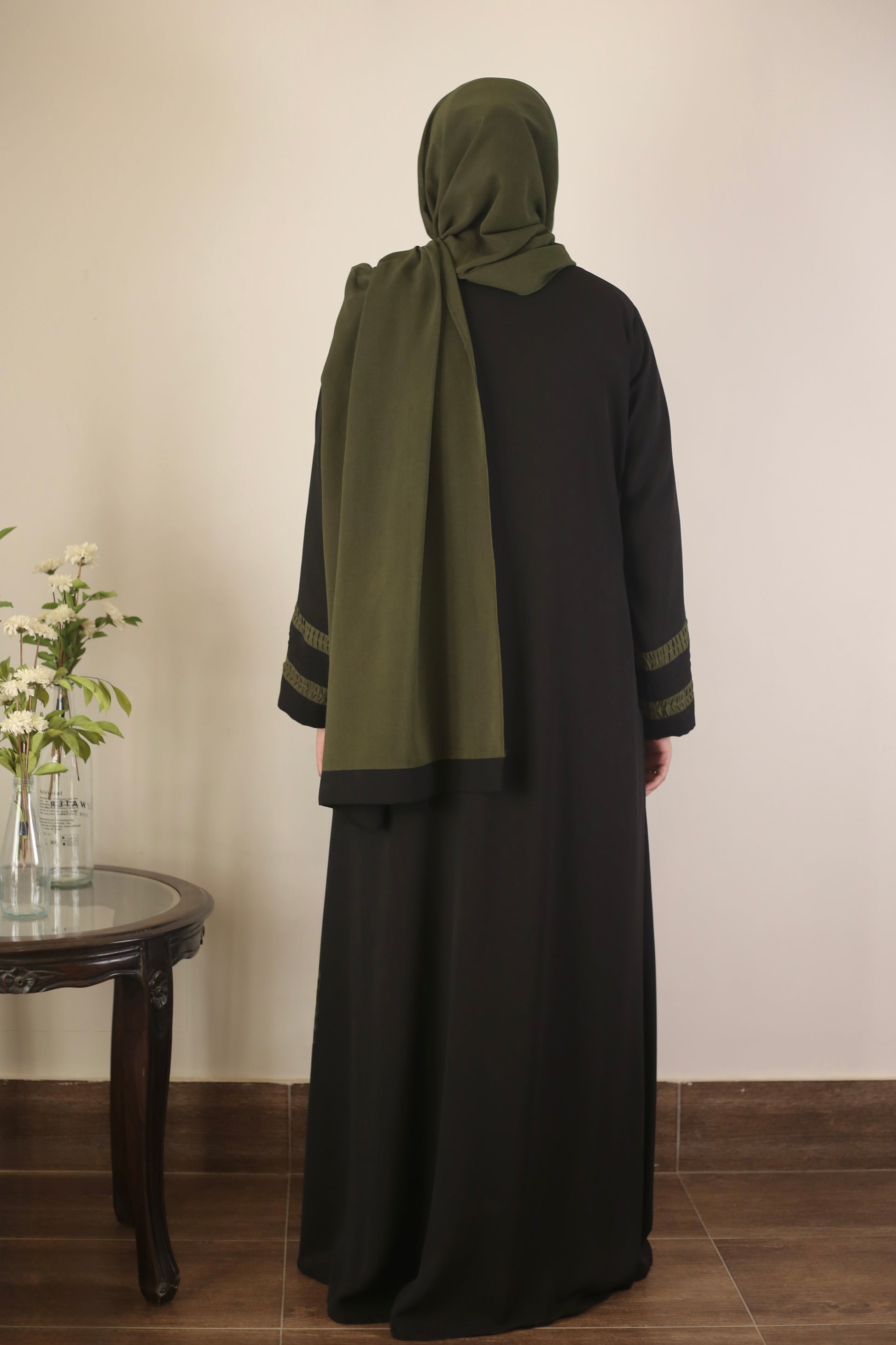 This graceful abaya features green pleated sleeves on flowy black georgette. Paired with a matching green hijab, finished with sleek black edges—a bold yet graceful statement!