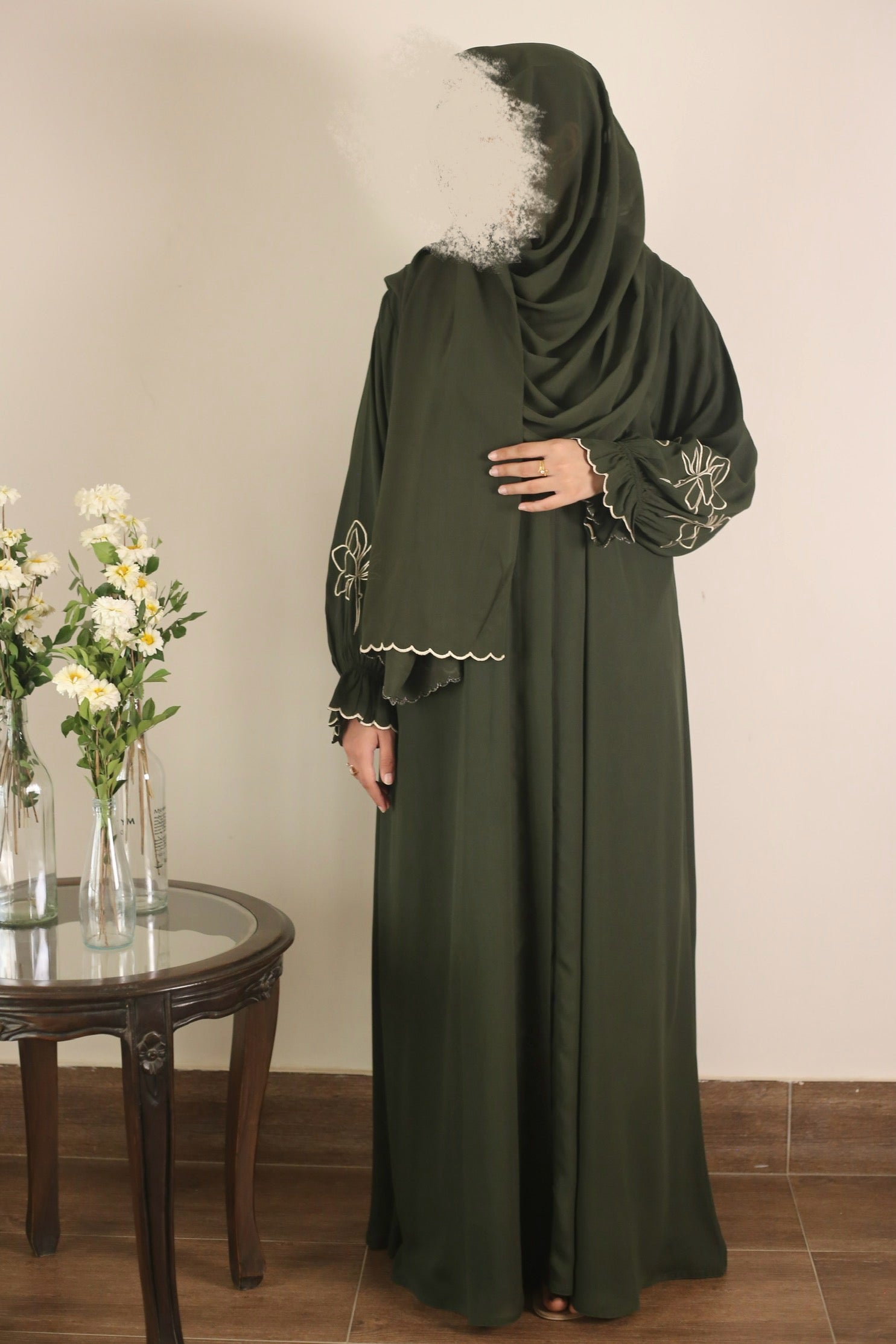 This elegant olive green abaya features delicate off-white embroidery and scalloped sleeve details—where sophistication meets subtle charm.
